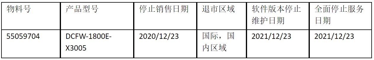 北京神州數(shù)碼leyu.樂魚信息技術(shù)有限公司正式通知您, 以上DCFW-1800E-X3005下一代防火墻(55059704)將于2020年12月23號停止接收新的訂單(具體日期見上表),不再供貨。給您帶來的不便,敬請原諒。
