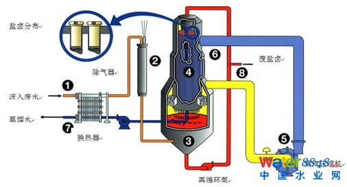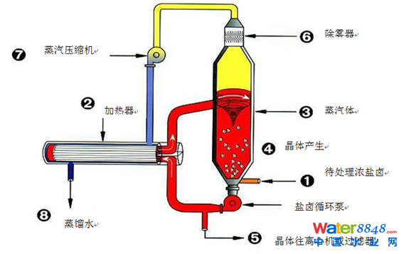 零排放技術(shù)利用蒸發(fā)方式從廢水中去除溶解性固體,并將蒸餾水經(jīng)過凈化和處理后可直接循環(huán)使用,不需要將水再排入河道或海洋。反滲透可用作預(yù)處理來濃縮廢水,濃縮后剩余水量需要蒸發(fā),大多數(shù)情況下,機(jī)械蒸汽在壓縮蒸發(fā)器在結(jié)晶前用作進(jìn)一步濃縮鹽水,循環(huán)后冷凝水可回用于工廠工藝段,實(shí)現(xiàn)廢水零排放。固體回用于工業(yè)原料和填埋。