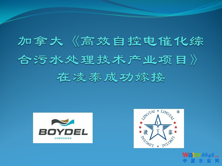 一種高效、自控、電催化綜合污水處理系統(tǒng)產(chǎn)業(yè)化項目在凌泰環(huán)保嫁接成功,世界領先的加拿大BOYDEL技術(shù)公司在中國獨家轉(zhuǎn)讓。