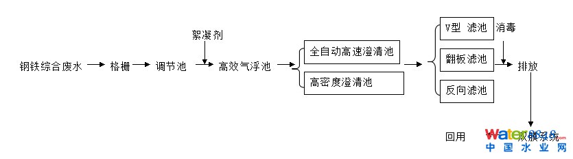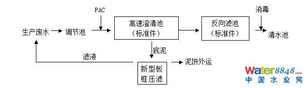自來水廠的生產(chǎn)廢水主要來自沉淀池或澄清池排泥水和濾池反沖洗廢水,其中包含了原水中的雜質(zhì)以及水廠投加的藥劑殘留物,其水量一般約占水廠總制水量的3%~7%,由于環(huán)境保護(hù)需要,這部分泥水不能直接排放,另外水資源成本越來越高,因此需對(duì)這部分水進(jìn)行合理的回收處理和污泥脫水處置。工藝如下: