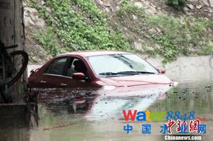 記者趕到積水較嚴(yán)重的韓莊街地道橋附近看到,橋下積水約80cm,一輛紅色轎車陷在水中,積水已到車窗位置,有市民拿來皮艇劃水嬉戲。據(jù)目擊市民介紹,16時,該紅色轎車欲從橋下穿行,沖到橋下后被淹熄火,車內(nèi)一男子立刻打開車窗爬了出來,未造成人員傷亡。