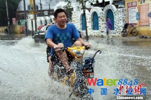 市民在韓莊街騎車通過積水路段。于俊亮攝
