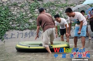 4日下午,大雨過后,有保定市民拿出充汽艇在積水中玩耍。于俊亮攝