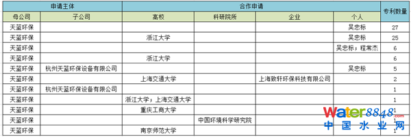 天藍環(huán)保的前身為浙江天藍脫硫除塵有限公司,后更名為浙江天藍環(huán)保技術(shù)股份有限公司,母公司申請專利190件(包括與子公司、高校及其他公司的合作申請),占總量的 95%。天藍環(huán)保的合作申請專利較多,共有76件,具體合作申請專利的情況如表3所示。從表中可以看到,天藍環(huán)保和浙江大學(xué)、上海交通大學(xué)、重慶工商大學(xué)和南京師范大學(xué)均有技術(shù)合作,技術(shù)合作內(nèi)容為煙氣脫硫脫銷工藝及方法。除此之外,天藍環(huán)保還有兩個重要的合作申請人,吳忠標(biāo)和程常杰,分別為天藍環(huán)保的董事長和總經(jīng)理,同時吳忠標(biāo)為浙江大學(xué)環(huán)境與資源學(xué)院的教授、博士生導(dǎo)師,主要從事大氣污染控制與治理、污染控制與資源化等方面的研究和教學(xué),尤其是在燃煤污染控制技術(shù)的研究方面具有明顯的特色,為浙江大學(xué)大氣污染控制方向?qū)W術(shù)帶頭人。