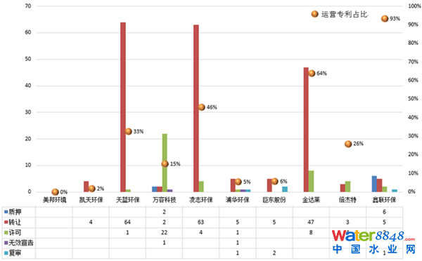 從上圖可以看出,除美邦環(huán)境之外,其他9家公司均有涉及專利運營事件。運營專利數(shù)量較多的公司有凌志環(huán)保、天藍環(huán)保和金達萊,但僅涉及轉(zhuǎn)讓和許可,且多發(fā)生在公司內(nèi)部,包括母公司和子公司之間或者公司董事長等員工和母子公司之間。萬容科技涉及運營專利27件,包括22件專利許可(被許可人為其下屬子公司)、 2件專利轉(zhuǎn)讓、2件專利質(zhì)押及1件無效宣告(CN1238244A)。鑫聯(lián)環(huán)?倢@繛15件,其中14件涉及專利運營,包括6件專利質(zhì)押、5件專利轉(zhuǎn)讓、2件專利許可和1件專利復(fù)審(CN102765843A)。浦華環(huán)保有8件運營專利,其中專利轉(zhuǎn)讓5件,許可、無效(CN2799046Y)及復(fù)審(CN102786106A)各1件。巨東股份的7件運營專利中包含2件復(fù)審案件(CN102047399A、CN101180170A)。此外,倍杰特和凱天環(huán)保也有少許的專利轉(zhuǎn)讓和許可行為。