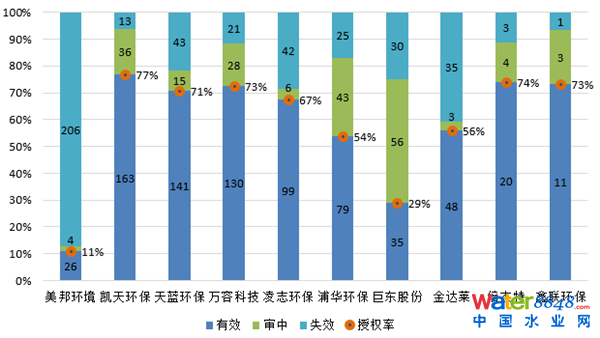 有效專利是指在檢索當(dāng)日或日前,被檢索的專利被授權(quán)或者已經(jīng)獲得專利權(quán),并且仍處于有效狀態(tài),受到專利法律保護。專利授權(quán)率為授權(quán)專利量與總專利量的比值。本節(jié)法律狀態(tài)的分析是基于各掛牌公司的中國專利數(shù)據(jù)。圖4為新三板環(huán)保行業(yè)重點掛牌公司專利法律狀態(tài)分析圖。
