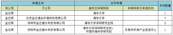 金達萊前身為江西金達萊環(huán)保實業(yè)有限公司,后更名為江西金達萊環(huán)保研發(fā)中心有限公司,2012年整體變更為股份有限公司,更名為江西金達萊環(huán)保股份有限公司。母公司申請專利84件,占總量的76%,子公司及個人轉(zhuǎn)讓所得專利占24%。金達萊的合作專利申請具體情況如表4所示,金達萊和子公司北京金達清創(chuàng)環(huán)境科技有限公司和深圳市金達健水科技有限公司均和清華大學(xué)有技術(shù)合作,主題關(guān)于水體檢測(生物傳感器)及修復(fù)。
