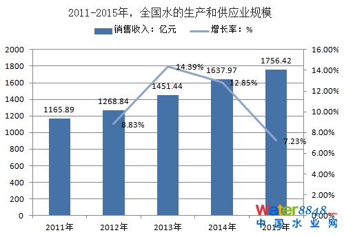 相關(guān)報告顯示:截至2014年底,我國規(guī)模以上水的生產(chǎn)和供應(yīng)業(yè)企業(yè)數(shù)量總計1346家,截至2015年,全國水的生產(chǎn)和供應(yīng)業(yè)規(guī)模以上企業(yè)數(shù)量達1491家。2015年,我國水務(wù)行業(yè)規(guī)模以上企業(yè)資產(chǎn)總額達9807.78億元;水的生產(chǎn)和供應(yīng)業(yè)企業(yè)銷售收入1756.42億元,同比增長了7.23%;銷售毛利率為25.04%;成本費用利潤率為6.11%;銷售利潤率為5.94%;總資產(chǎn)利潤率為1.06%;自來水的生產(chǎn)和供應(yīng)行業(yè)共計實現(xiàn)銷售收入為1323.39億元,同比增長8.26%。