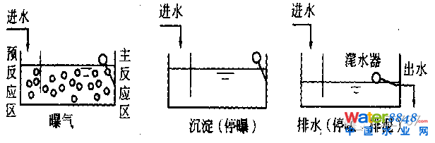 SBR工藝的基本運行模式由進(jìn)水、反應(yīng)、沉淀、出水和閑置五個基本過程組成,從污水流入到閑置結(jié)束構(gòu)成一個周期,在每個周期里上述過程都是在一個設(shè)有曝氣或攪拌裝置的反應(yīng)器內(nèi)依次進(jìn)行的。