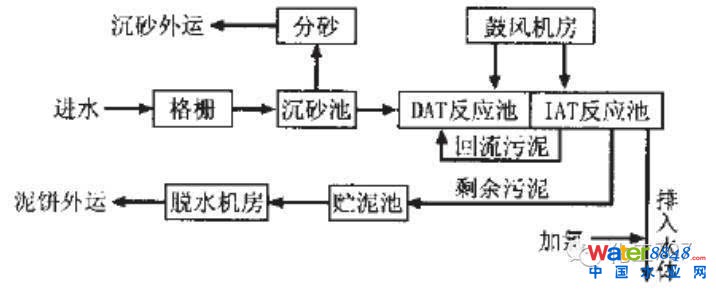 DAT池和IAT池串聯(lián)組成,DAT 連續(xù)進(jìn)水,連續(xù)曝氣(也可間歇曝氣),IAT也是連續(xù)進(jìn)水,但間歇曝氣,清水和剩余活性污泥均由IAT池排出。和典型的SBR 反應(yīng)池一樣,IAT 池運行操作由進(jìn)水、反應(yīng)、沉淀、出水和待機5個階段組成。