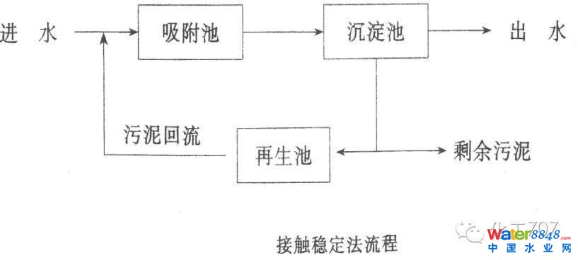 混合液曝氣過程中第一階段BOD5的下降是由于吸附作用造成的,對于溶解的有機物,吸附作用不大或沒有,因此,把這種方法稱為接觸穩(wěn)定法,也叫吸附再生法;旌弦旱钠貧馔瓿闪宋阶饔,回流污泥的曝氣完成穩(wěn)定作用。