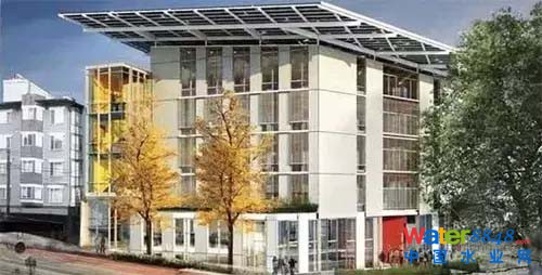 在西雅圖布利特中心的太陽能電池板下,屋頂收集的雨水通過濾池的過濾后可以生產(chǎn)出飲用水。同時,洗滌和沐浴的灰水收集后通過人造濕地過濾,然后進(jìn)入土壤,回歸自然。這個建筑最為知名之處可能是其廁所用水非常少,每次使用只消耗兩湯匙的水。