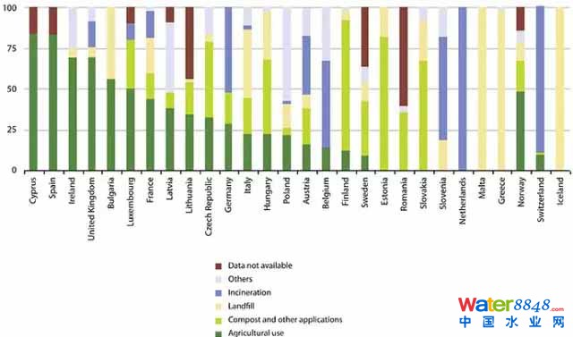 Eurostat統(tǒng)計的2009年歐洲各國城市污水處理廠對產(chǎn)生污泥的處置方式