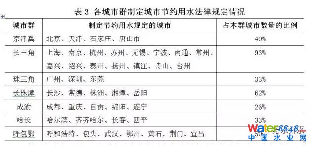 1988年原建設(shè)部頒布了《城市節(jié)約用水管理規(guī)定》,并于1989年1月1日起執(zhí)行,是目前指導(dǎo)全國城市節(jié)約用水的唯一政策。該規(guī)定首次建立了城市實(shí)行計(jì)劃用水和節(jié)約用水制度,包括制定節(jié)約用水發(fā)展規(guī)劃、節(jié)約用水年度計(jì)劃、行業(yè)綜合用水定額、單項(xiàng)用水定額、超計(jì)劃用水繳納超計(jì)劃用水加價(jià)水費(fèi)等制度。表3是各城市群88個(gè)城市制定節(jié)約用水法規(guī)規(guī)章的情況。48%的城市制定了節(jié)約用水規(guī)定。