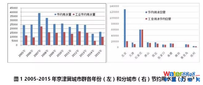 京津冀城市群水資源十分缺乏,但在用水效率提高的前提下,可以通過調(diào)整產(chǎn)業(yè)規(guī)劃與用水定額來實(shí)現(xiàn)用水總量的零增長。2005-2015年期間,2007年節(jié)約用水量達(dá)到高峰,之后逐年下降(見圖1左)。