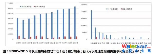 長三角城市群2005-2015年期間,污水處理總量持續(xù)增長,2015年是2005年的1.55倍。但再生水利用量并沒有顯著增長,再生水利用總量僅占污水處理總量的9%,各年份之間差異較大,總體呈現(xiàn)減少趨勢,2015年為2005年利用量的79%(見圖10左)。上海、南京和杭州的污水處理總量最大,僅上海市就占到全部總量的37%,三個(gè)城市總和占到全部總量的62.5%。南京市和蘇州市再生水利用量最大,分別占到全部總量的35%和23%。再生水利用較少的城市有上海、杭州、嘉興、紹興、泰州和臺(tái)州(見圖10右)。