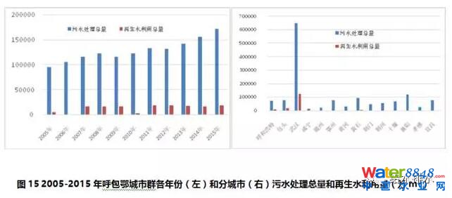 呼包鄂城市群2005-2015年期間,污水處理總量持續(xù)增加,2015年是2005年的1.79倍;再生水利用占污水處理總量的10.5%,2015年是2005年的3.5倍,2011年再生水利用量增長幅度很小(見圖15左)。再生水利用主要來自三個(gè)城市,武漢市、包頭市和呼和浩特市,占城市群全部再生水利用總量的97%,武漢市更是占到了81%,黃石和十堰市有很小比例的再生水利用(見圖15右)。