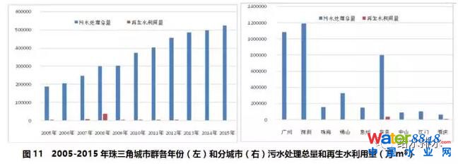 珠三角城市群2005-2015年期間,污水處理總量持續(xù)增加,但再生水利用量并沒有與之同比例增加,再生水利用總量占污水處理總量的占比僅為1.6%(見圖11左)。這可能是由于該地區(qū)雨水豐沛,污水處理后的水作為生態(tài)用水更為經(jīng)濟(jì)[1]。2008年珠三角城市群再生水利用量達(dá)到峰值,且主要來自東莞市和肇慶市(見圖11右)。