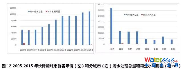 長株潭城市群2005-2015年期間,污水處理總量持續(xù)增加,2015年污水處理總量達(dá)到10億m³,是2005年的2.2倍。2002-2008年期間廢水排放總量基本與經(jīng)濟(jì)增長水平保持同步遞增趨勢,且廢水排放生產(chǎn)率快速提高,總體環(huán)境污染負(fù)荷較高。盡管長株潭城市群2005年至2010年期間工業(yè)廢水排放達(dá)標(biāo)率持續(xù)改善,但區(qū)域上中下游城市污水集中處理率分別為15.3%、31.8%、49.4%,水污染問題嚴(yán)重。2009年是長株潭城市群污水處理量提升的一個(gè)關(guān)鍵年份,2009年以后污水處理量大幅度提升,這可以有效改善區(qū)域生態(tài)環(huán)境資源承載能力。但再生水利用量沒有同比例增加,其用量僅為污水處理總量的1.2%(見圖12左)。除長沙和株洲外,湘潭、岳陽、常德、益陽、衡陽和婁底這六個(gè)城市均無再生水生產(chǎn)和利用行為(見圖12右)。研究表明,長株潭城市群2030年城市化率達(dá)到90%、第二產(chǎn)業(yè)和第三產(chǎn)業(yè)持續(xù)增長的態(tài)勢下,只有將污水處理率提高到100%、污水回用率提高到35%的條件下,才不會(huì)產(chǎn)生水資源供需缺口狀況[7]。提升城市群再生水利用率是實(shí)現(xiàn)水資源供需平衡的一個(gè)重要措施。