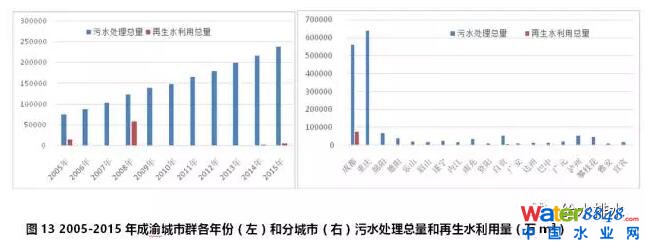 成渝城市群2005-2015年期間,污水處理總量持續(xù)增加,2015年污水處理總量達(dá)到13.8億噸,是2005年3.12倍。但再生水利用量沒有增加,反而比2005年降低了60%?傮w上,再生水利用總量僅為污水處理總量的5.2%(見圖13左)。再生水利用量最多的城市是成都市,達(dá)到7.39億m³,主要來自2005-2008年期間,2008年當(dāng)年利用量達(dá)到58150萬m³,但2009年僅為35萬m³,2013年以后再生水利用量為零。重慶市自2006年啟動(dòng)再生水利用以來逐年增加,從2006年的118萬m³,增長到2015年的854萬m³,增長了7.23倍。沒有統(tǒng)計(jì)或再生利用較少(見圖13右)。