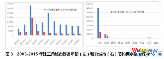 珠三角城市群2005-2015年期間,只有廣州市有完整的節(jié)約用水?dāng)?shù)據(jù),深圳、東莞、江門和肇慶2010年前有個(gè)別年份的節(jié)約用水?dāng)?shù)據(jù),珠海、佛山、惠州和中山則完全沒有進(jìn)行統(tǒng)計(jì)。2008年整個(gè)城市群節(jié)約用水量達(dá)到高峰,之后逐年下滑(見圖3左)。工業(yè)節(jié)約用水比重占全部節(jié)約用水總量的29.2%,廣州市為21.4%(見圖3右)。