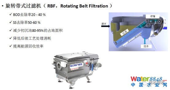 在污水處理領(lǐng)域近些年一個重要的動向是一級處理技術(shù)的發(fā)展,出現(xiàn)了幾個新的工藝。第一個是旋轉(zhuǎn)帶式過濾機(RBF),占地面積非常小,只占初沉池面積的10%左右,效率和初沉池的效率差不多,BOD去除率約20~30%、SS去除率約50~60%。