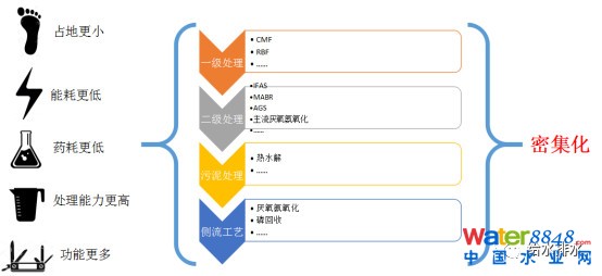 從過去這100年的污水處理技術(shù)發(fā)展歷程來看,污水處理技術(shù)正朝著越來越“密集化(Intensification)”的方向發(fā)展。密集化這個概念實際上是一個化工行業(yè)的術(shù)語,它是強調(diào)以化工原理和反應工程以及相關(guān)平衡特性為基礎,通過采用新設備、新工藝,顯著提升反應的過程速率,使工廠布局更加緊湊,提升能量效率,減少廢物排放。Intensification這個詞的中文翻譯有強化的意思,但我覺得這個強化和污水處理技術(shù)領(lǐng)域經(jīng)常提到的一級強化處理(CEPT)、強化生物除磷(EBPR)還不是完全一樣。Intensifcation稱之為密集化可能更合適一些,它的意思是工藝的發(fā)展將會使占地面積更小、能耗更低、處理能力更強、功能更多,下面通過幾個具體的技術(shù)來闡述密集化的概念。