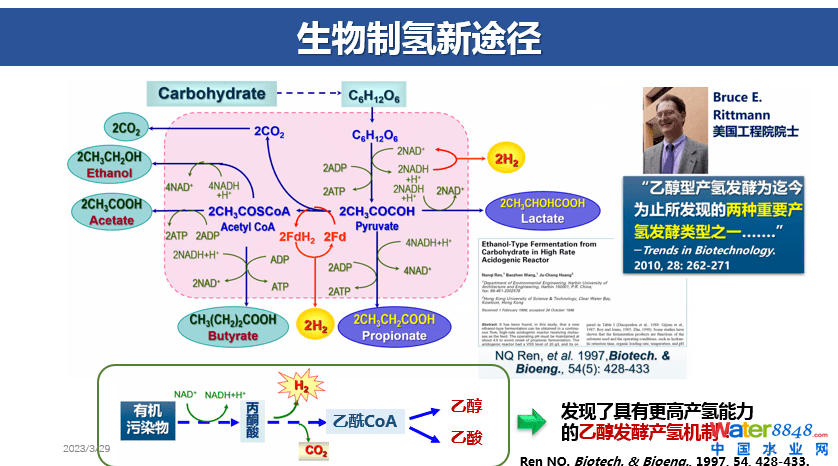 我們歸納了幾個綠氫生產(chǎn)瓶頸:首先是復雜微生物體系的產(chǎn)氫速率和氫回收率的提升。這是我們遇到的一個較大的問題,也是未來需要解決和突破的。第二就是技術(shù)經(jīng)濟性受限。隨著國家政策的相繼出臺,對綠氫生產(chǎn)的補貼包括支撐,可能會為將來綠氫的生產(chǎn)、研發(fā)、放大化,提供更好的路徑和指導方向。在上個世紀90年代,任南琪院士率先發(fā)現(xiàn)了獨特的乙醇型發(fā)酵制氫途徑,也是世界上用生物質(zhì)發(fā)酵來產(chǎn)氫的兩大途徑之一。