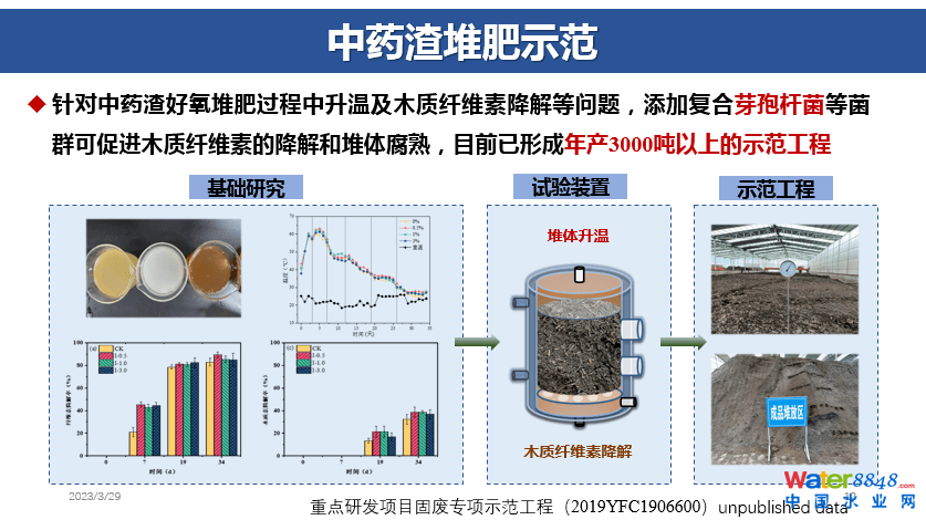 這里也研究了它的機制,主要從群落結(jié)構(gòu)入手,我們發(fā)現(xiàn)了關(guān)鍵的菌種,包括探討了不同地域的環(huán)境因子,控制因子與菌落之間形成的關(guān)系,也探索了菌落形成與腐殖質(zhì)定向合成的潛在機理。在中藥堆肥過程中,完成了一項工程,另一項也在試運行過程中,目前已經(jīng)形成了年處理三千噸以上的示范工程,出肥以后完全符合國家525-2021的標準。