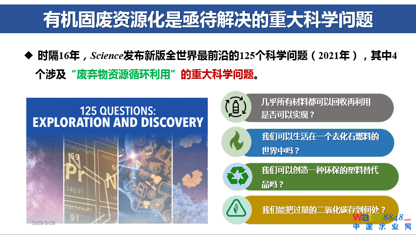 在Science發(fā)布的全世界最前沿的125個科學問題中,涉及廢棄物資源循環(huán)利用的重大科學問題有很多。其實我們國家與國際其他國家在有機固廢利用領(lǐng)域,相對比較同步,尤其我國又是一個有機固廢產(chǎn)量大國,這幾年有機固廢資源化一直是研究熱點,近兩年也發(fā)表了很多高水平文章,對于有機固廢將來的利用路徑進行了一些創(chuàng)造性的探討,也為將來的產(chǎn)業(yè)化提供了一些可行的思考方式。