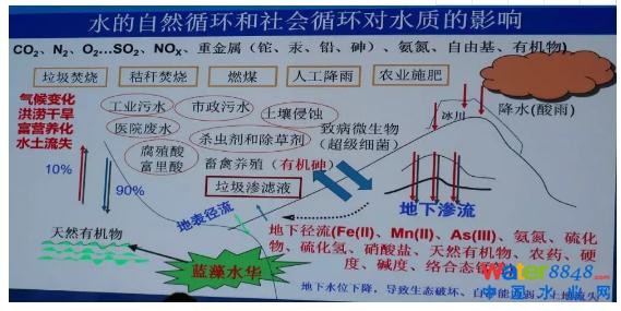 在自然循環(huán)中,由于氣候的變化會造成降雨不均勻,從而導致有的地方洪澇,有的地方干旱。由于溫度的變化會使磷釋放,還有可能導致水土流失。在水的遷移過程中,大氣將各種污染物引入水中,比如硫化物、氮氧化物,焚燒、燃煤也會引入重金屬、氨氮、磷、自由基。降雨過程中污染物會隨著地下滲流進入地下水體造成污染。在地表水污染的過程中,還會引入一些污染物,例如工業(yè)污水、市政污水、醫(yī)院廢水、養(yǎng)殖和垃圾滲濾液。特別是地表水和地下水互換的過程中,鐵錳會和有機物進行絡(luò)合。同時地下水呈還原狀態(tài)以后,砷和錳是游離的,砷有毒且很難去除。另外一些藻類的繁殖也會導致嗅味。