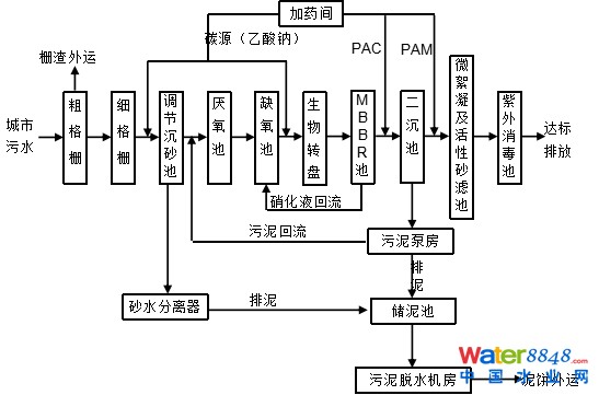 1、背景 平陰縣第三污水處理廠污水處理采用“一級處理+生物轉(zhuǎn)盤+MBBR池+活性砂濾池+紫外消毒”的處理工藝,污泥處理采用帶式濃縮脫水一體機處理,根據(jù)工程實施規(guī)劃,平陰縣第三污水處理廠總規(guī)模為600